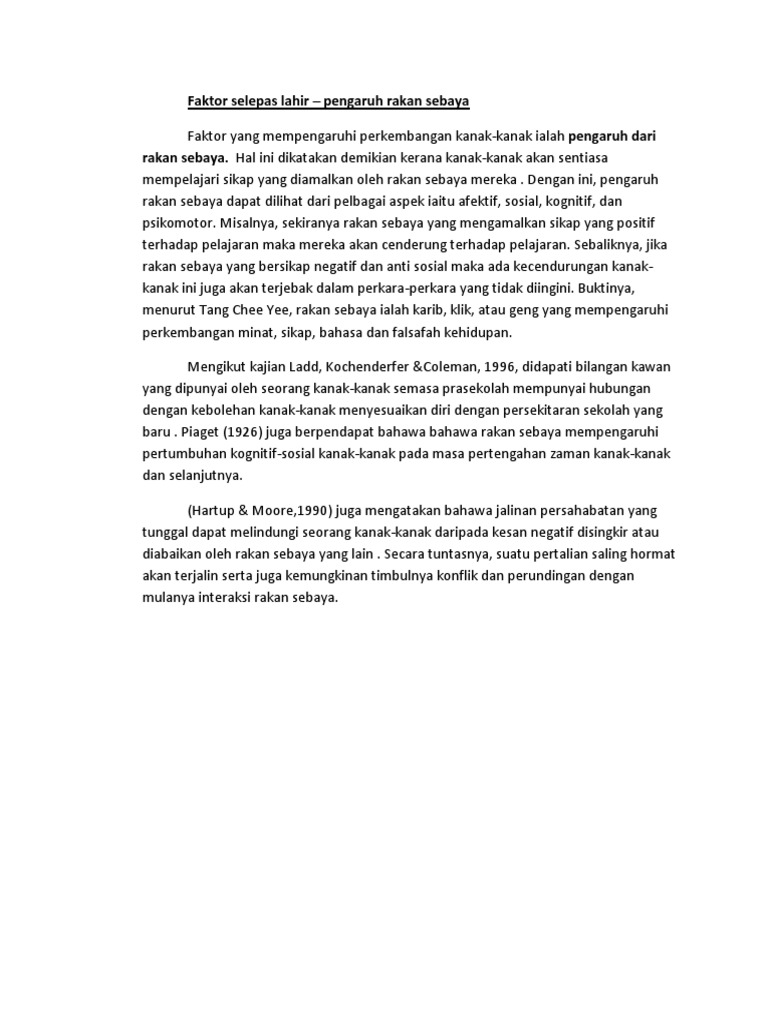 Faktor selepas lahir pengaruh rakan sebaya Faktor yang mempengaruhi perkembangan kanak-kanak ialah pengaruh dari rakan sebaya. Oleh sebab itu gejala sosial yang disebabkan oleh remaja dipengaruhi oleh rakan sebaya semakin bertambah kerana tiada siapa yang boleh menilai perbuatannya. Pada usia awal remaja mereka mudah dipengaruhi.